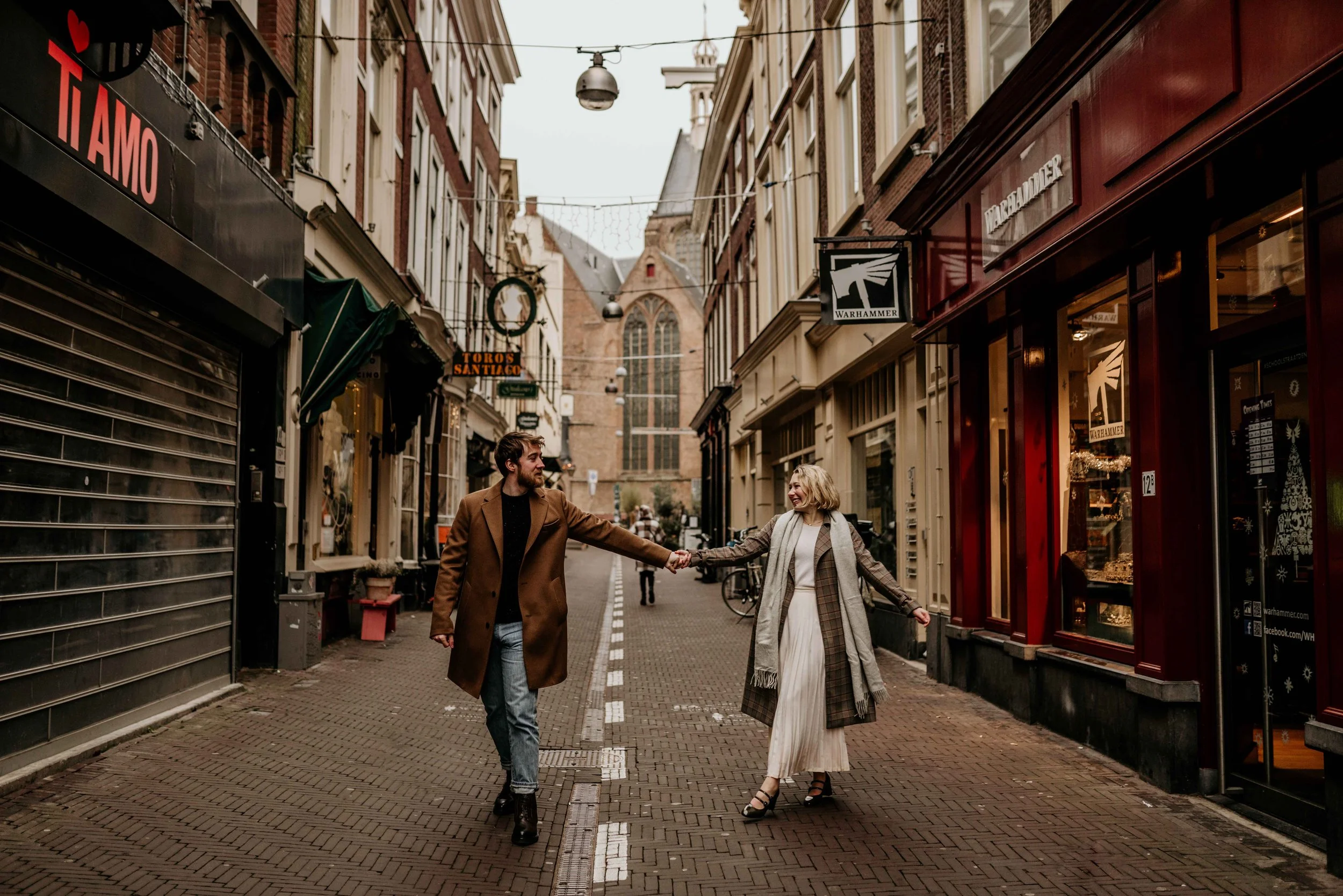 First, we walked through the most romantic streets in The Hague. The timing was perfect- the streets were almost empty, and the warm lights from the shop windows created a beautiful atmosphere. Despite it the photoshoot took place in the city center it felt intimate and relaxed.